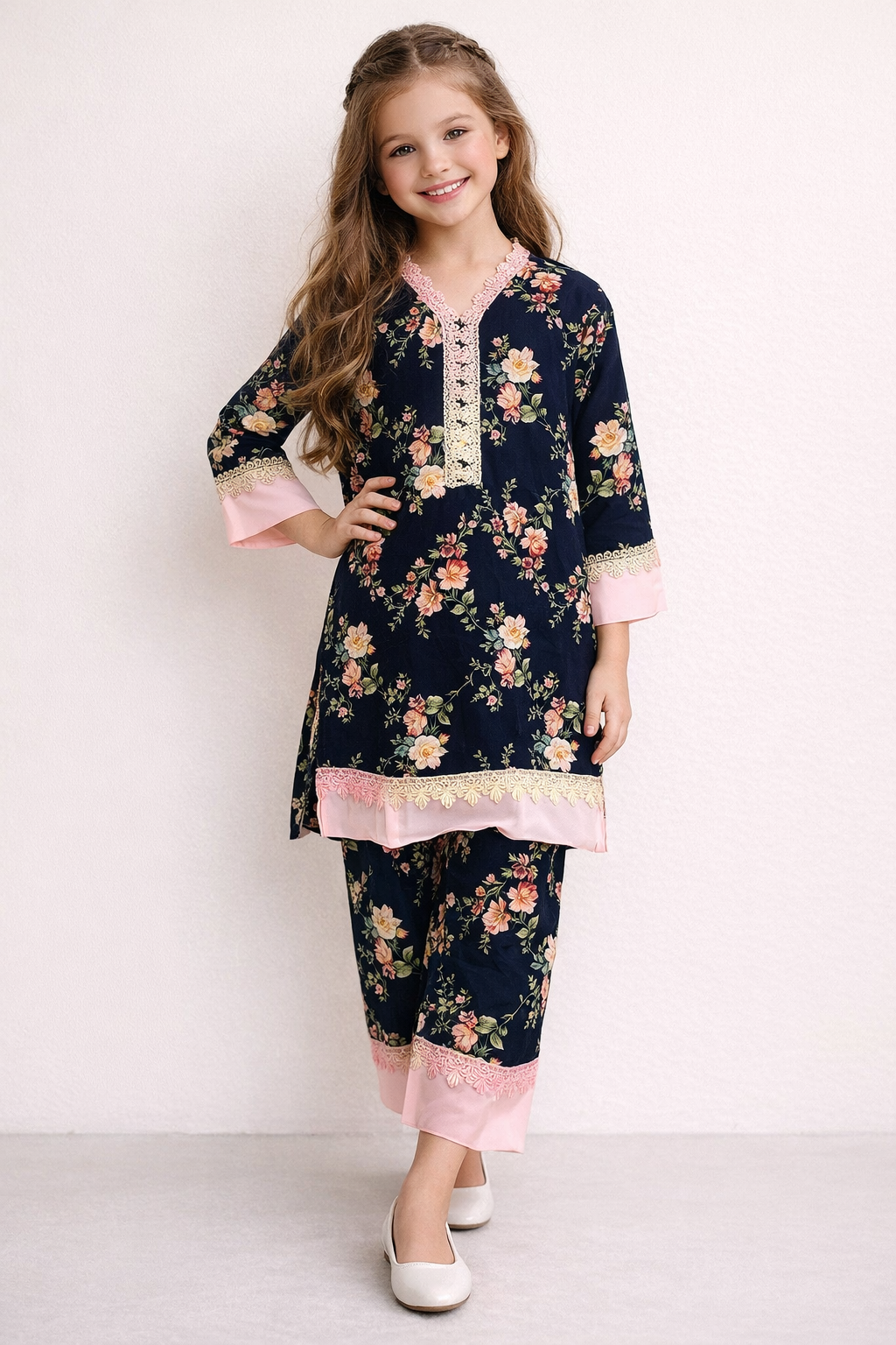 Bring effortless elegance to your little girl’s wardrobe with this girls navy blue floral kurti pant set, designed to balance comfort, charm, and timeless style. Crafted from soft, breathable premium fabric, this outfit is gentle on young skin and ideal for all-day wear.