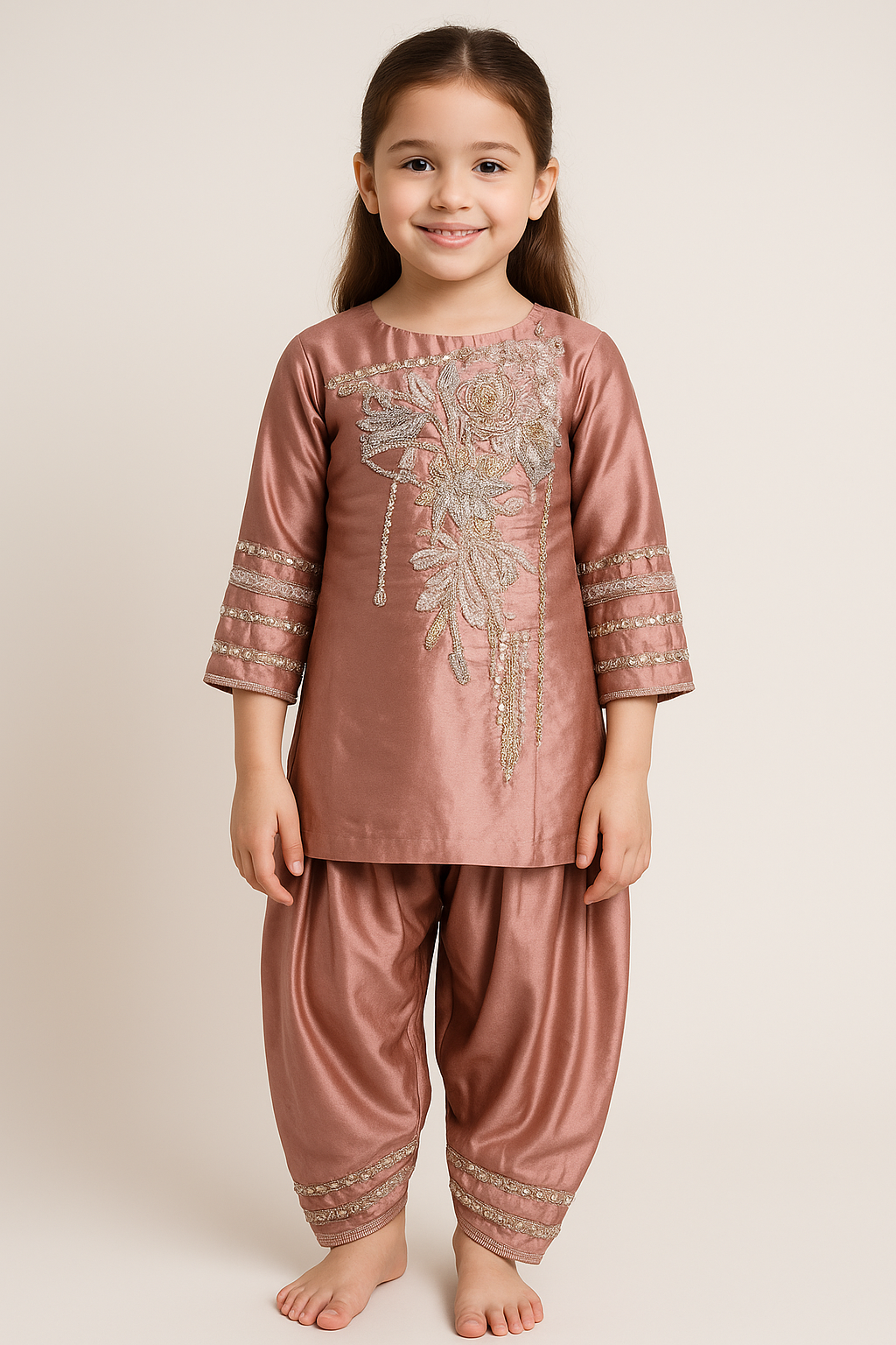Let your princess dazzle in this rose gold embroidered kurti & dhoti pant set from House of IQF. Designed with a blend of traditional charm and modern elegance, this outfit is perfect for festivals, weddings, and special celebrations.