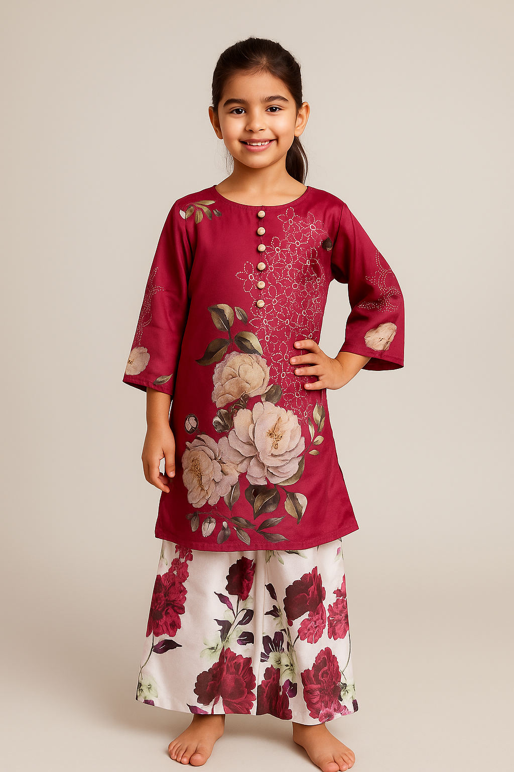 Add a touch of charm to your little one’s wardrobe with our Girls Floral Printed Kurti Set, designed to blend elegance with comfort. The maroon kurti features delicate floral prints with button detailing on the neckline, giving it a graceful, modern touch. Paired with wide-leg pants in contrasting floral patterns, this set creates a stylish yet comfortable outfit perfect for parties, festive gatherings, and special occasions.