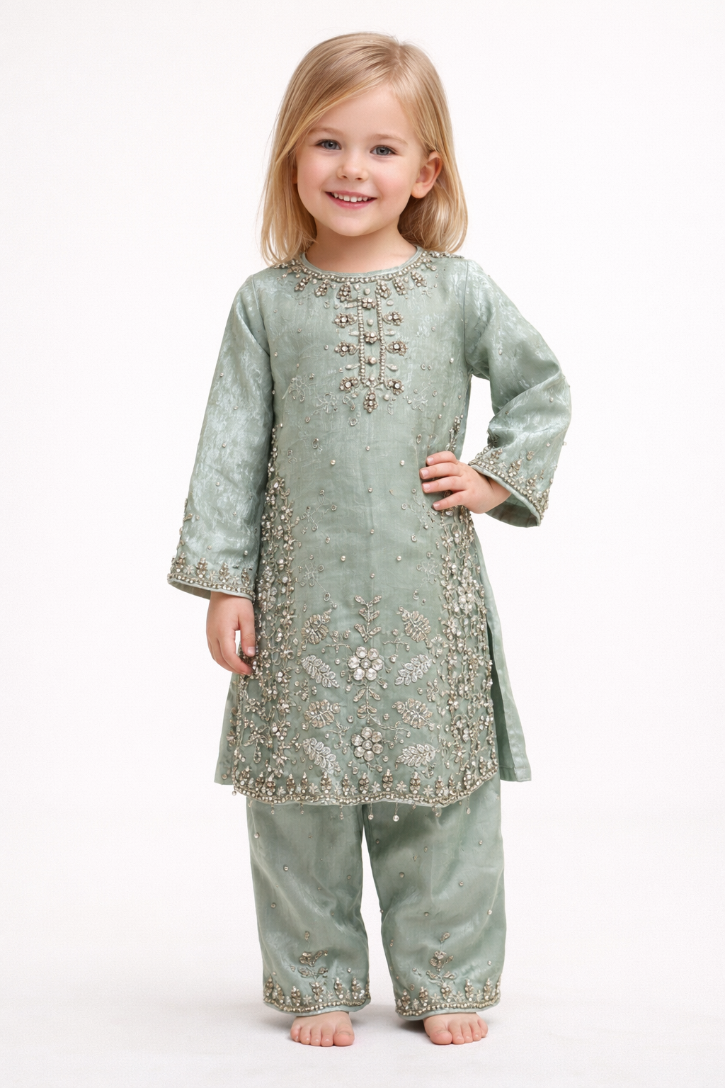 Elevate your little one’s festive wardrobe with this beautiful sage green embroidered kurti set for girls, designed to blend soft elegance with luxurious detailing. Crafted from premium festive fabric, this outfit feels lightweight, breathable, and gentle on delicate skin while offering a refined ethnic look.